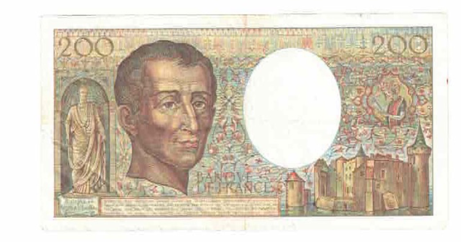Description avers : A droite, à côté des armoiries des Secondat de La Brède (la famille dont est issue le philosophe), le portrait en buste de Montesquieu inspiré de celui en marbre sculpté par Jean-Baptiste Lemoyne (Mairie de Bordeaux) et sur le côté gauche, l’on peut voir une figure allégorique tenir un blason mentionnant L’Esprit des lois, référence à l’ouvrage majeur du philosophe des Lumières. On remarque aussi à gauche deux points en relief pour faciliter la reconnaissance du billet par les non-voyants.