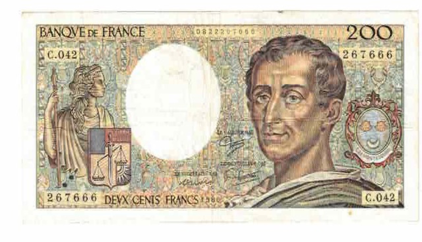Description avers : A droite, à côté des armoiries des Secondat de La Brède (la famille dont est issue le philosophe), le portrait en buste de Montesquieu inspiré de celui en marbre sculpté par Jean-Baptiste Lemoyne (Mairie de Bordeaux) et sur le côté gauche, l’on peut voir une figure allégorique tenir un blason mentionnant L’Esprit des lois, référence à l’ouvrage majeur du philosophe des Lumières. On remarque aussi à gauche deux points en relief pour faciliter la reconnaissance du billet par les non-voyants.
