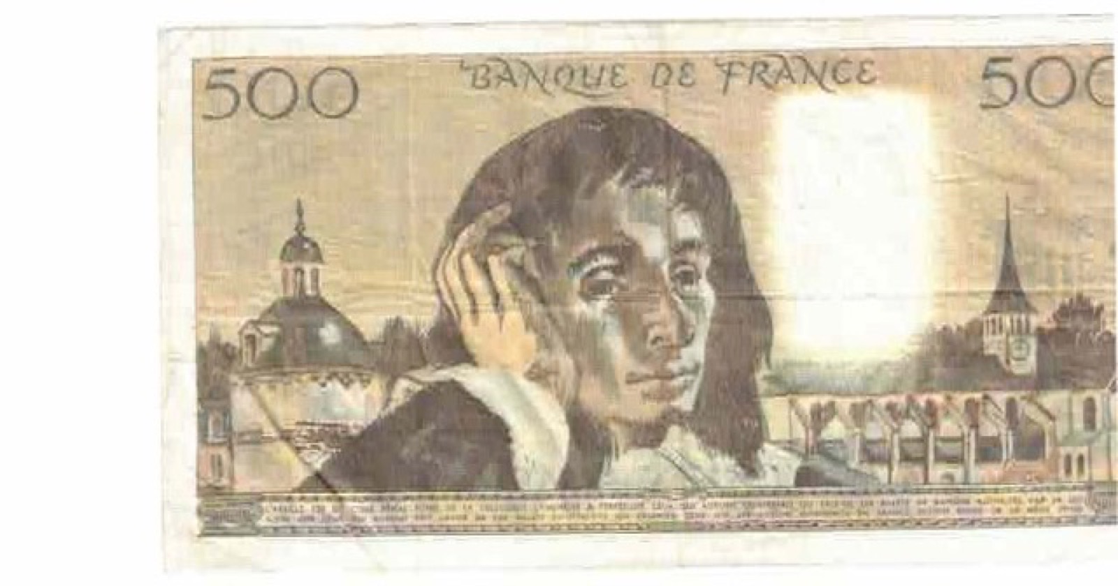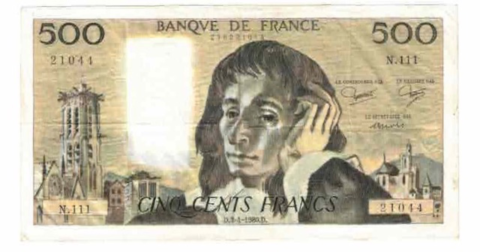 Description avers : Au centre, Blaise Pascal reposant sa tête sur sa main et en fond à gauche le clocher de l’église Saint-Jacques-la-Boucherie (tour Saint-Jacques) à Paris et à droite, l’église Notre-Dame-de-Prospérité à Clermont-Ferrand. Le portrait de Pascal s’inspire de celui exécuté à la sanguine par Jean Domat en 1644-1645