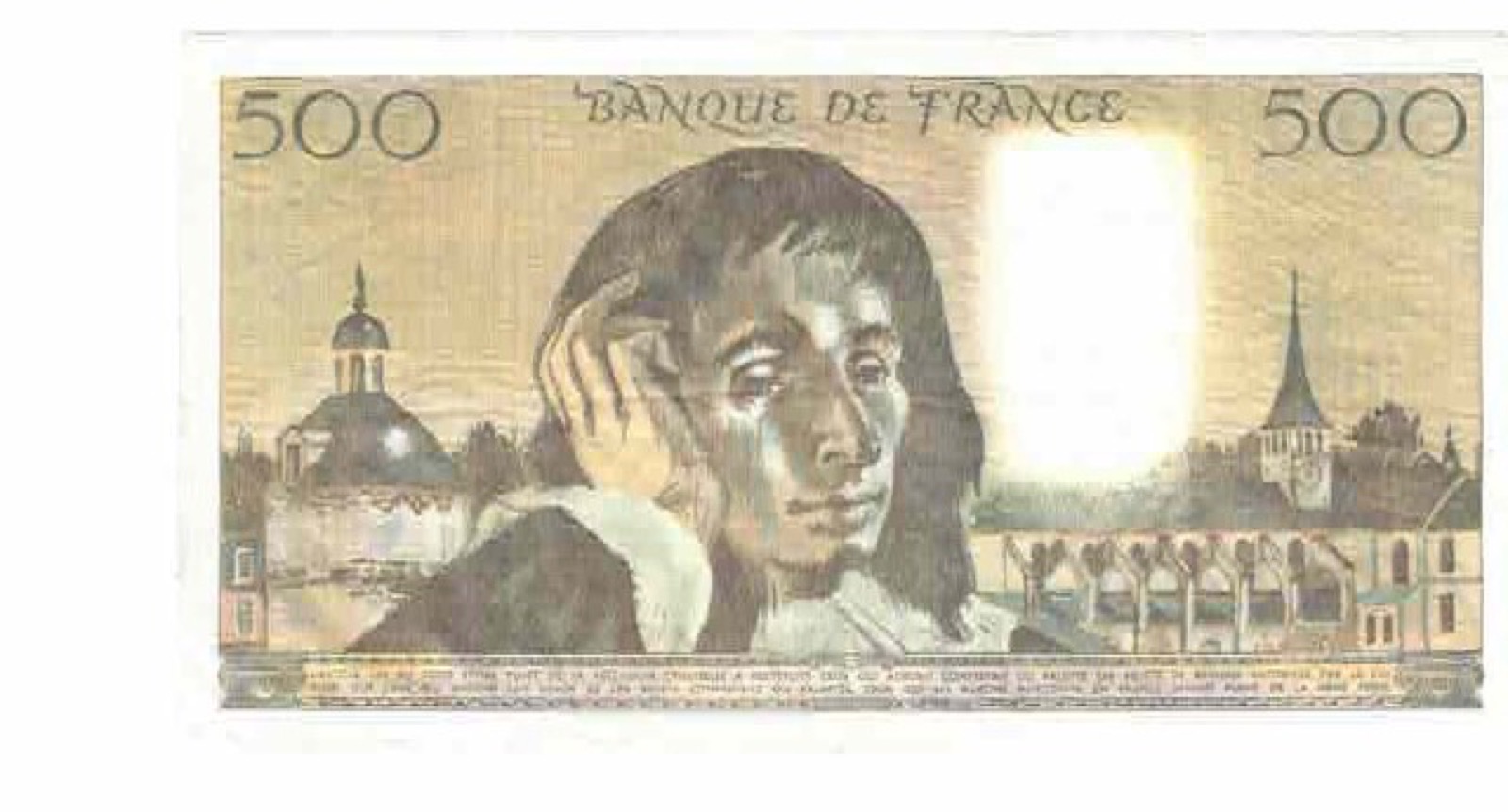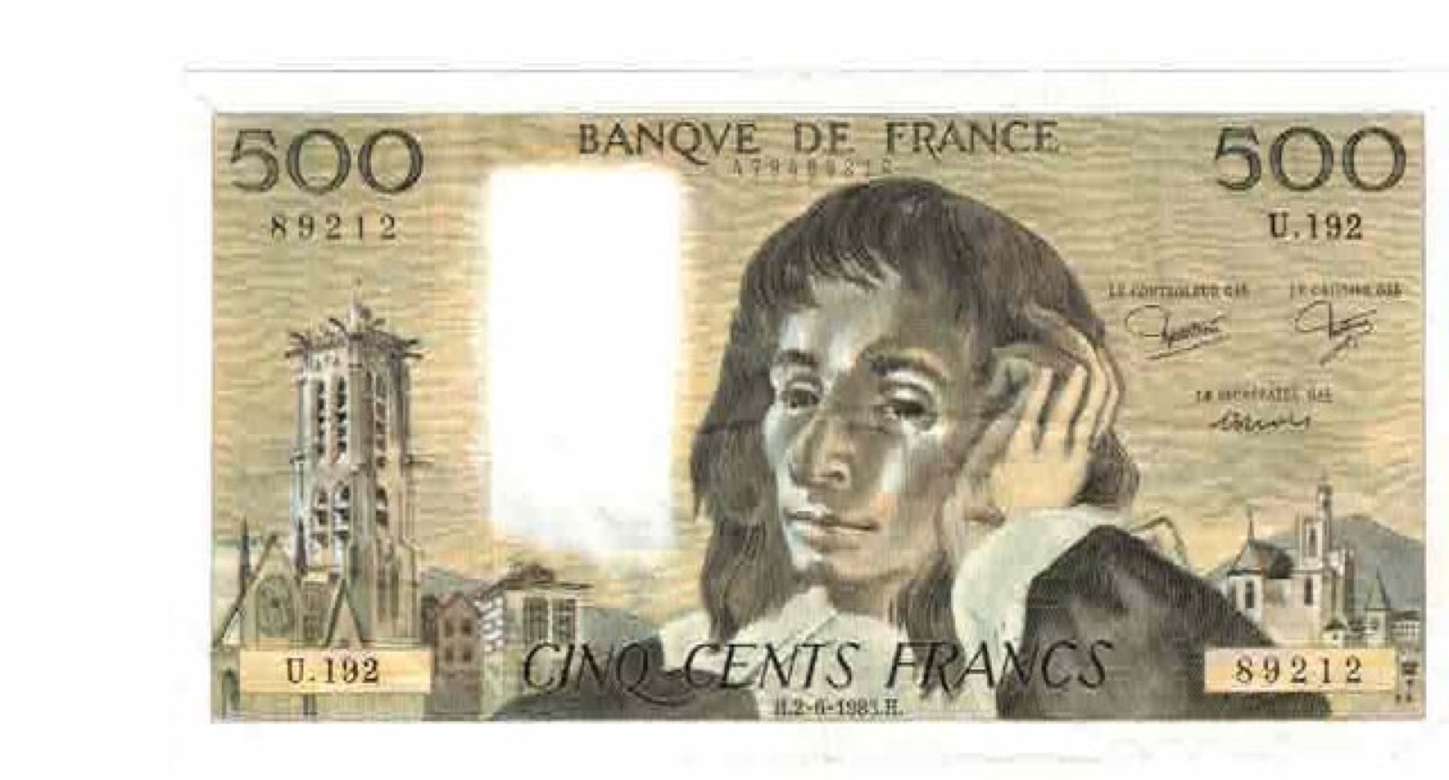 Description avers : Au centre, Blaise Pascal reposant sa tête sur sa main et en fond à gauche le clocher de l’église Saint-Jacques-la-Boucherie (tour Saint-Jacques) à Paris et à droite, l’église Notre-Dame-de-Prospérité à Clermont-Ferrand. Le portrait de Pascal s’inspire de celui exécuté à la sanguine par Jean Domat en 1644-1645