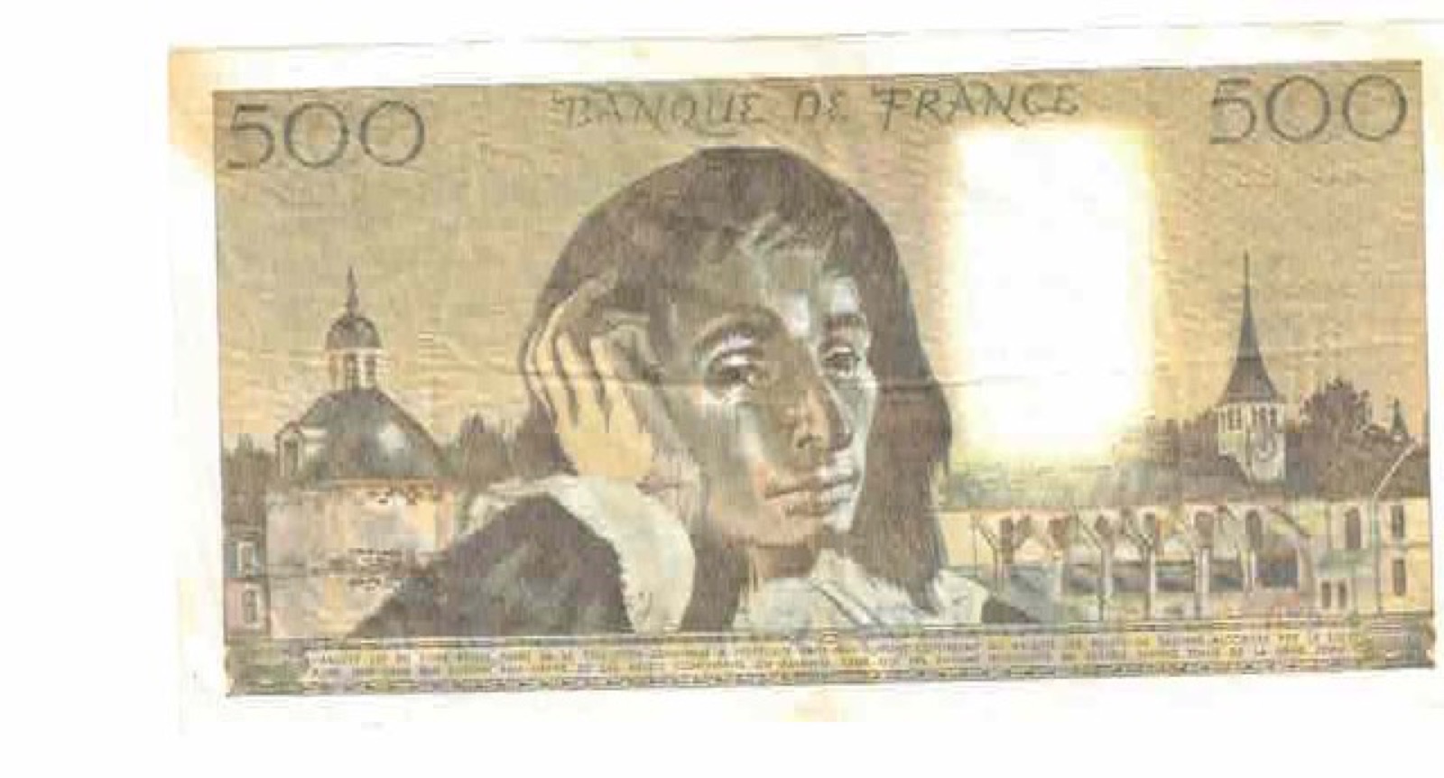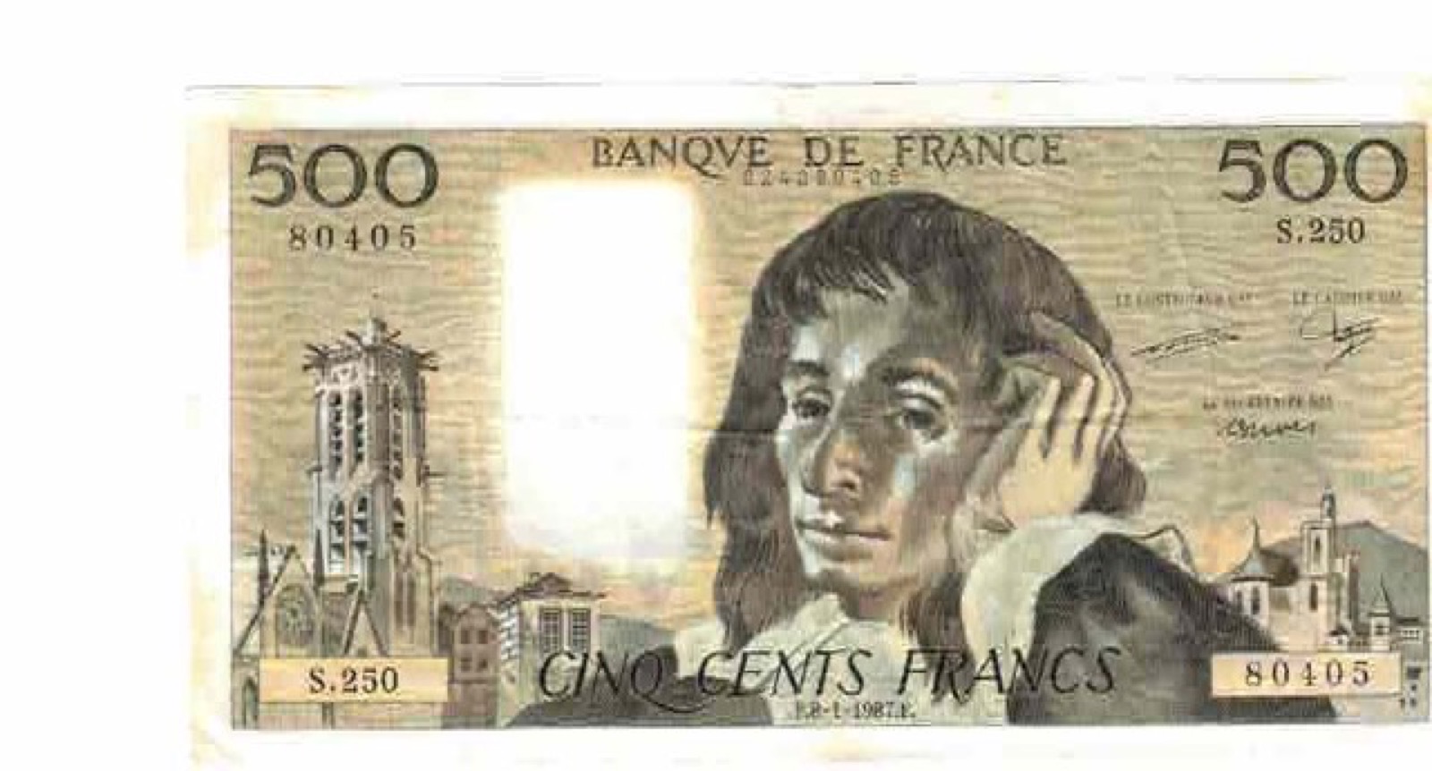 Description avers : Au centre, Blaise Pascal reposant sa tête sur sa main et en fond à gauche le clocher de l’église Saint-Jacques-la-Boucherie (tour Saint-Jacques) à Paris et à droite, l’église Notre-Dame-de-Prospérité à Clermont-Ferrand. Le portrait de Pascal s’inspire de celui exécuté à la sanguine par Jean Domat en 1644-1645
